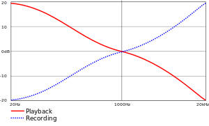 當播放時把1,000Hz以下電平逐步增益;1,000Hz以上電平漸次減弱,對應唱片上的反RIAA特性(1,000Hz以上增強,1,000Hz以下衰減),進行補償回來(RIAA等化曲線:紅色線),還原出一條平直的頻率曲線。