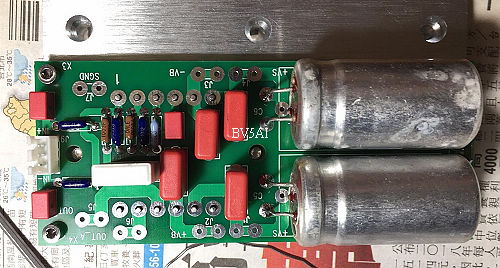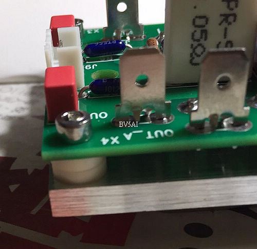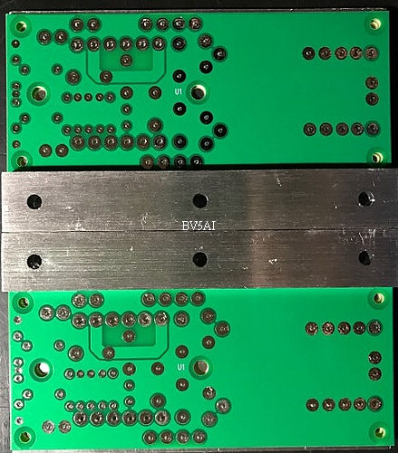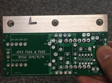 組裝焊接電阻電容請由低往高、由內往外施工!依照片插PIN先不用插!仔細檢查後!用兩片墊片將加工好得PCB用M3螺絲固定於散熱轉接板上後焊接PA04!插上插PIN焊接! |