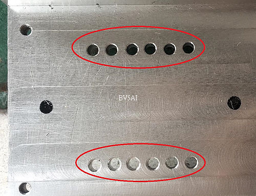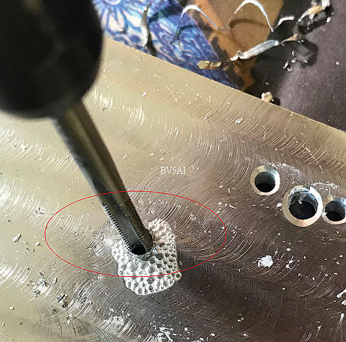 使用直徑 3~3.5mm鑽頭擴孔並打穿。用5mm以上鑽頭用手旋轉就能銑倒角!如不幸打偏了可以用大一點的鑽頭擴孔,詳看紅色圈圈處! |