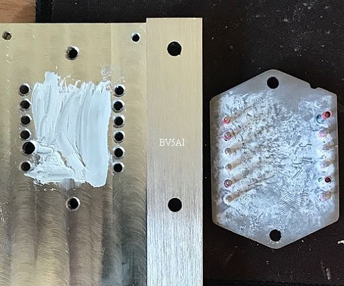 將加工完成散熱轉接板清潔後,均勻塗上散熱膏(嚴禁使用電腦 CPU用含銀散熱膏)。PA04接腳套上絕緣套(可使用熱縮管) |